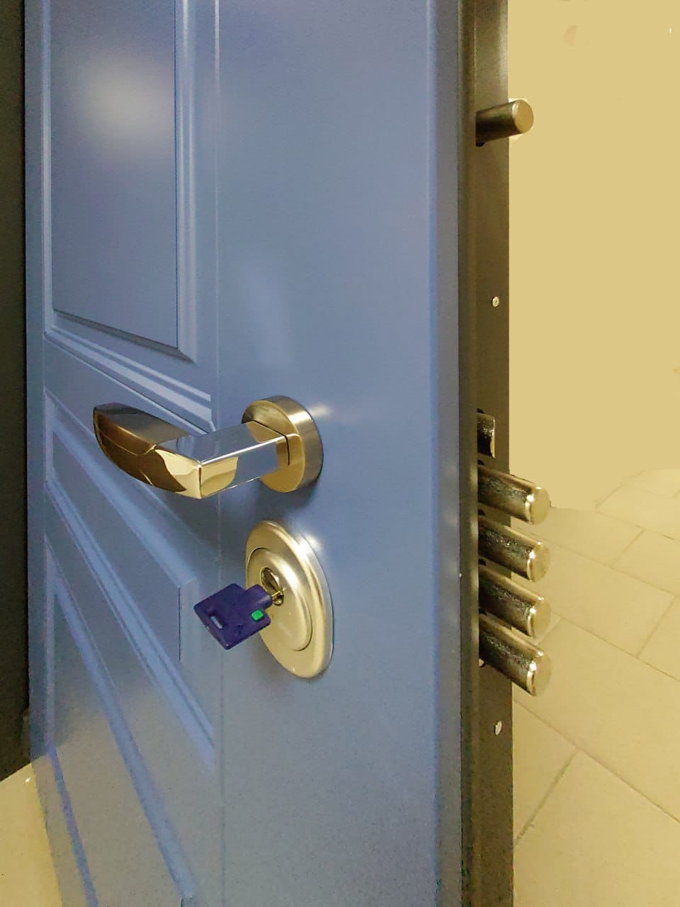 Fabricamos puertas blindadas Mul-T-Lock con cerraduras integradas y refuerzos metálicos de alta resistencia.
